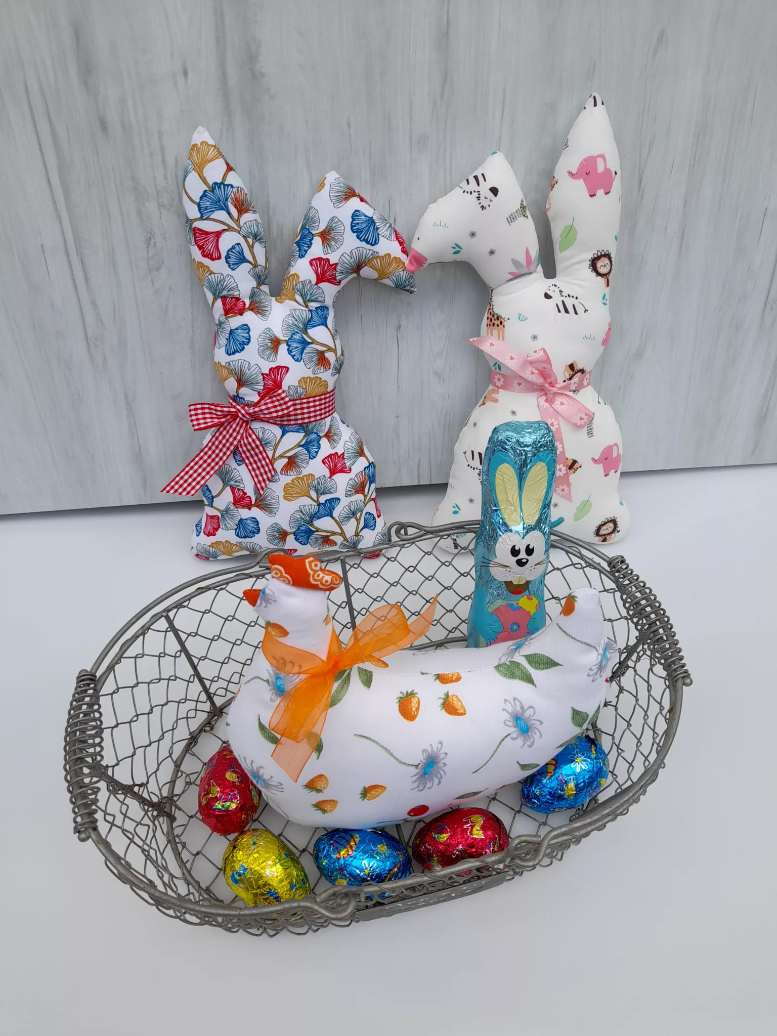 Un lapin bariolé fait main, en tissu, un modèle parfait pour une décoration de votre intérieur !