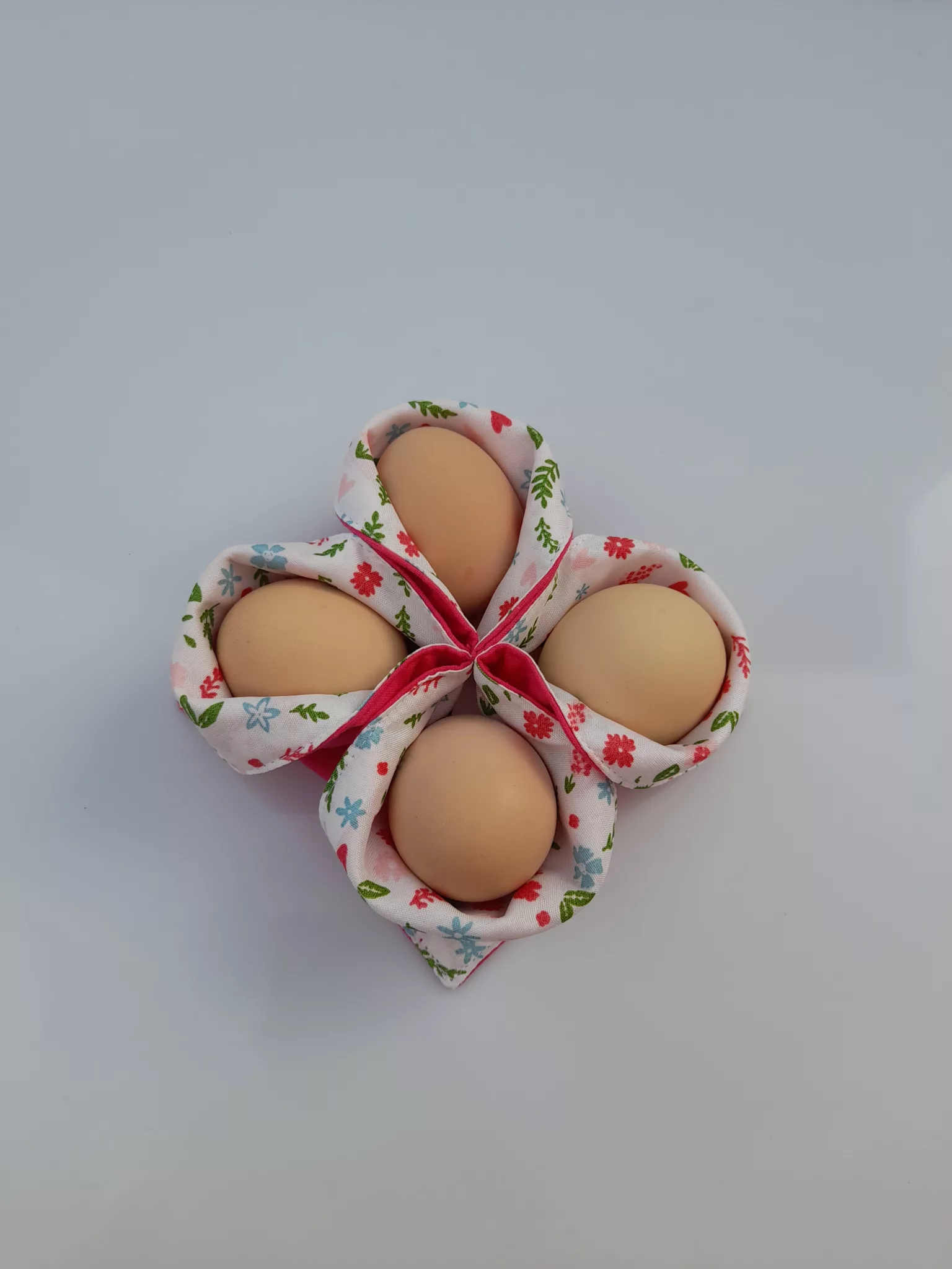 Une originale panière à oeufs en tissu de coton. Une pièce unique et parfaite pour une décoration de table. Idéal pour Pâques !