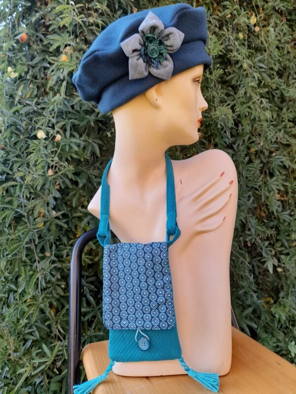 Une belle pochette portable bleue avec une belle harmonie de couleurs assorties. Entièrement doublée et molletonnée à l’intérieur. Fait main.